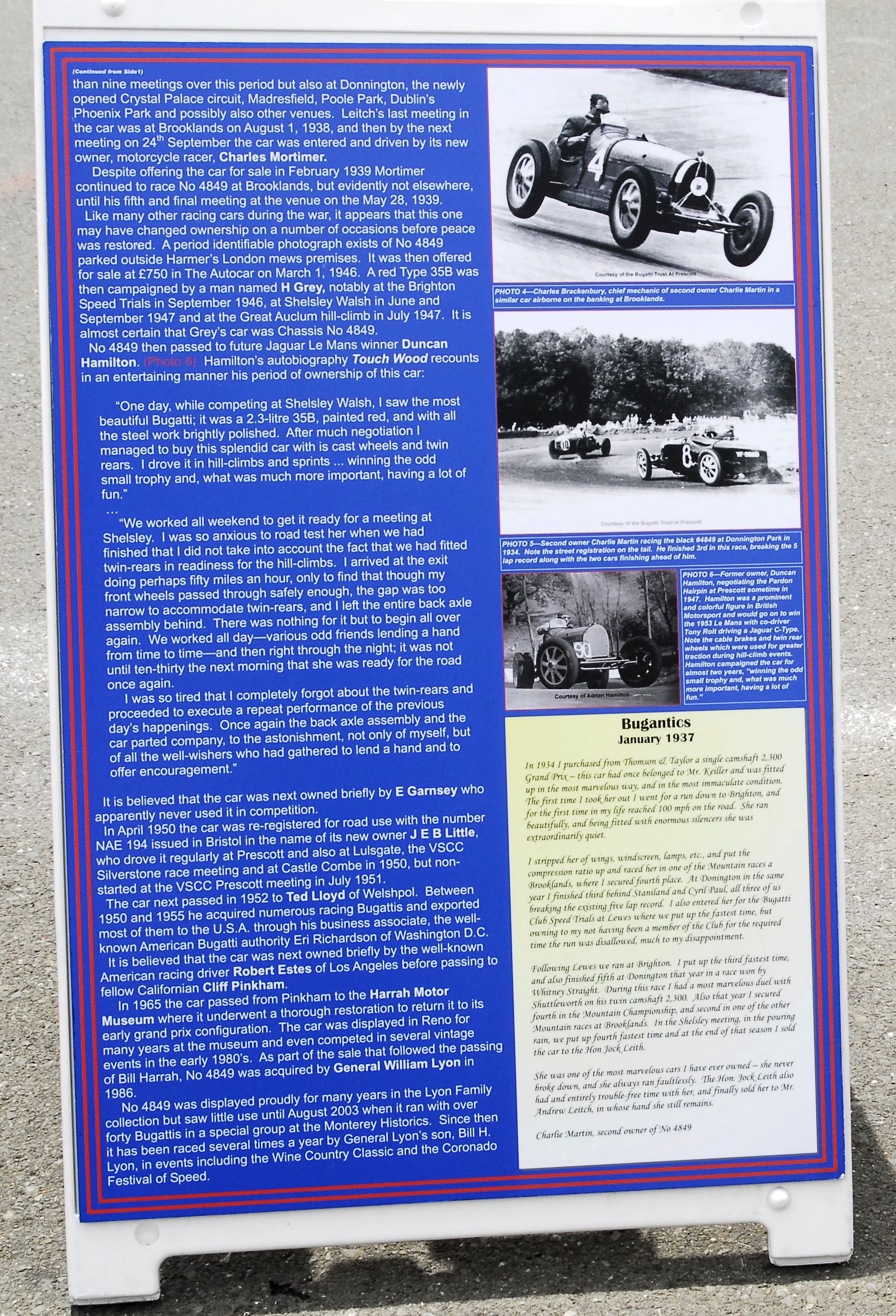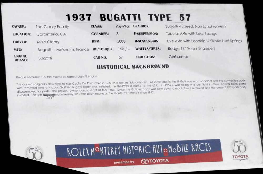 This car was first sold as a bare Type 23 - length chassis, with a Brescia twin-magneto engine, to an owner in Australia who had a body fitted to it. Its chassis was converted to the proper Type 13 style in the 1930s. After more transformations, this Bugatti was used as both a touring and competition car in Australia and England. A later owner campaigned it in the United States. In 1996 it appeared at the 75th anniversary of the Primo Gran Premio d'Italia back in Brescia. Source: Pebble Beach Concours d'Elegance