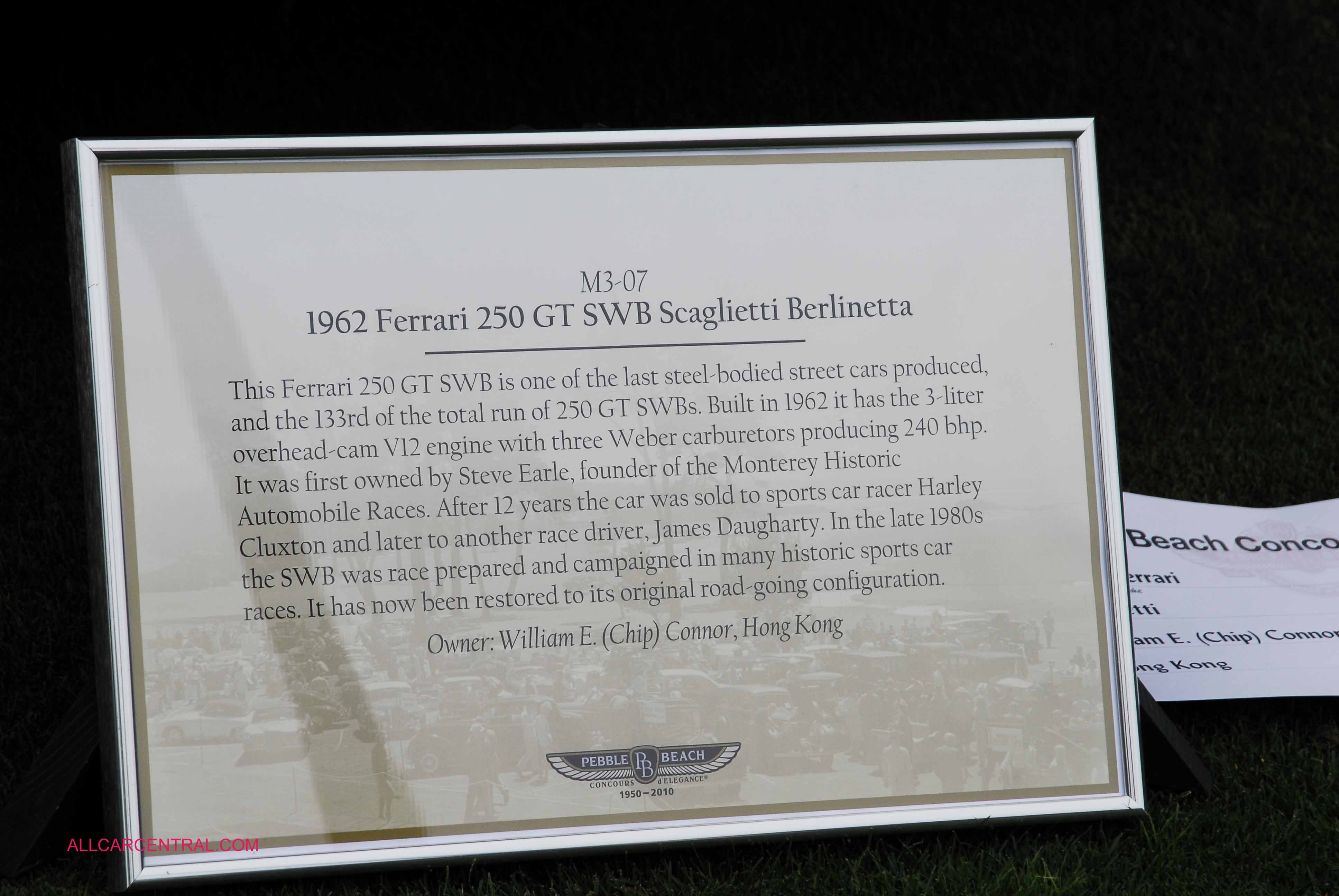 Ferrari 250 GT SWB Scaglietti Berlinetta sn-3337 1962. This berlinetta was the first of the steel-bodied cars built by Scaglietti in the final series. The car remained with Ferrari in Italy until it was purchased by Steve Earle, founder of the Monterey Historic Automobile Races, who kept it for 12 years. Pebble Beach Concours d'Elegance 2017