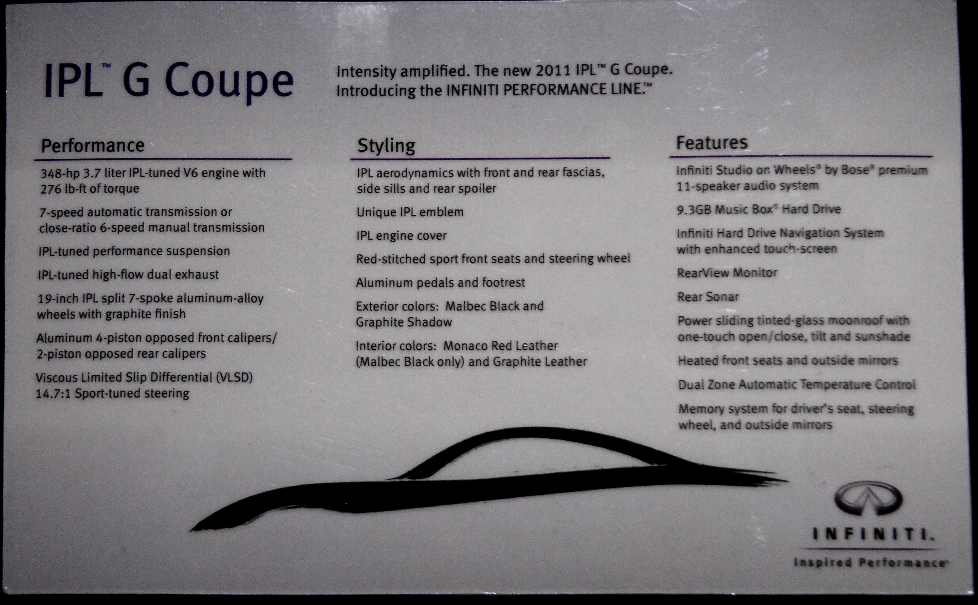 Infiniti prefers the dark drama unveilings of their new models during the Pebble Beach Concours d'Elegance. AllCarCentral was invited to enjoy some great finger food and sparkling wine as we all crowded into the Infiniti tent. The IPL G37 was under wraps as the people milled around. With a bit of fanfare the cover was pulled off and we all enjoyed an up-close look. The IPL G37 is billed as having a 3.7-liter (3,696cc) V6, DOHC
