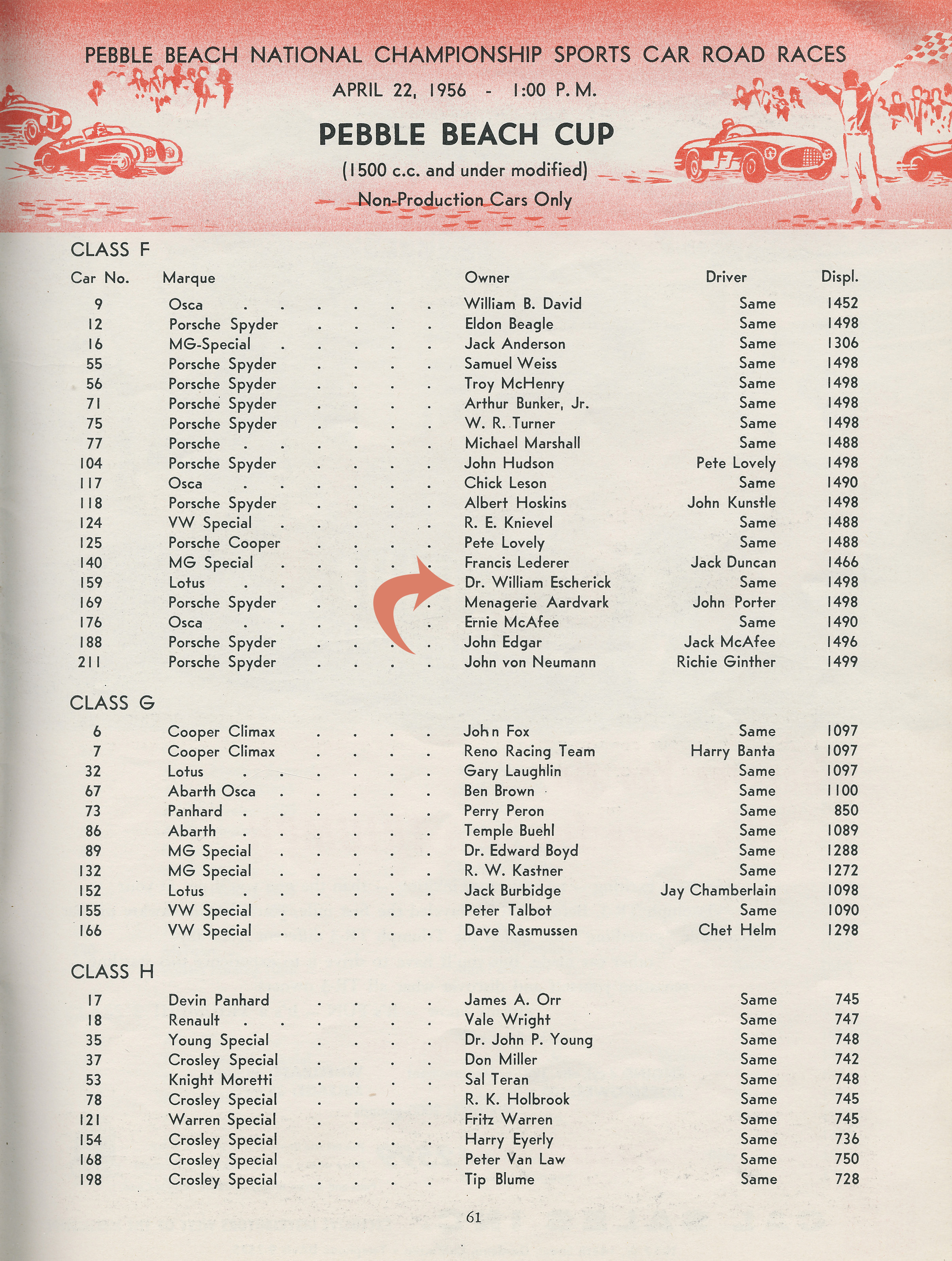 The Potus had been drawing the attention of curious spectators that morning. Essentially the car was a Lotus Mark IX fitted with a Porsche 4-cam engine. The hood had been removed and the Porsche engine with its tall fan housing seemed somewhat incongruous in the Lotus' front engine bay. The engine, according to a sign beside the car, was the actual unit salvaged from James Dean's wrecked Porsche Spyder. The aura of James Dean, the actor, and the mysterious circumstances surrounding his violent death a few months earlier seemed uncomfortably close that cold foggy morning. My program for the races listed the Potus only as a Lotus and assigned the number 159 to the car. Dr.William Eschrich (with his name slightly misspelled) as the owner and driver, was scheduled to compete in the Under 1500cc Modified Group. Dr. McHenry's Porsche Spyder was also running in the same group.