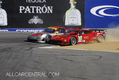 The Risi Competizione Ferrari F458 ltalia of Melo and Vilander bumps through the Corkscrew with the Flying Lizards Motorsports Porsche 911 GT3 RSR of Long and Bergmeister. Long and Bergmeister finished 1st in GT Class with Melo and Vilander coming in 3rd. American Le Mans Series Monterey 2011 Mazda Raceway Laguna Seca